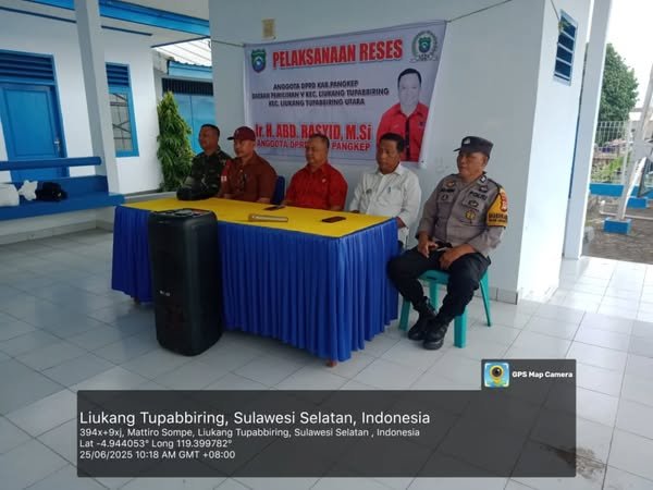Pangkep, Sulawesi Selatan, Lintasnusa.com — Serka SB. Mose, Babinsa Kelurahan Mattiro Sompe dari Koramil 1421-05/Liukang Tupabbiring, Kodim 1421/Pangkep, menghadiri kegiatan reses Temu Konstituen Anggota DPRD Kabupaten Pangkep dari Daerah Pemilihan (Dapil) V, Ir. H. Abd. Rasyid, M.Si. Acara ini diselenggarakan di Dermaga Beton, Pulau Balang Lompo, Kelurahan Mattiro Sompe, Kecamatan Liukang Tupabbiring, Kabupaten Pangkep, pada Rabu (25/6/2025).