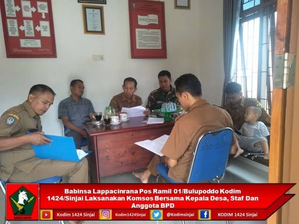 Sinjai, 24 Februari 2025 – lintasnusa.com- Babinsa Desa Lappacinrana Pos Ramil 1424-01/Bulupoddo, Kopda Faisal, melaksanakan Komunikasi Sosial (Komsos) bersama Kepala Desa, staf, dan anggota Badan Permusyawaratan Desa (BPD). Kegiatan ini bertujuan untuk memantau perkembangan wilayah binaan serta mempererat sinergitas antara TNI dan aparat pemerintah daerah.