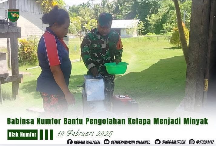 lintasnusa.com – Wujud kepedulian terhadap warga binaannya kembali ditunjukkan oleh Babinsa Koramil 1708-05/Numfor Serda Otto Wanma yang ikut membantu warga dalam proses pembuatan minyak kelapa di Kampung Supmander, Distrik Orkeri, Kabupaten Biak Numfor, Senin (10/2/2025).