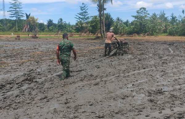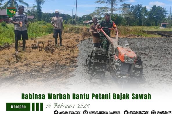 Waropen – lintasnusa.com–Guna mendukung Program Ketahanan Pangan Nasional dan mendukung peningkatan kesejahteraan Petani yang ada diwilayah binaannya, Serka Julkarnain Babinsa Koramil 1709-03/Waropen Bawah Kodim 1709/Yawa, terjun langsung ke sawah untuk membantu pengolahan lahan padi dengan melakukan pembajakan lahan yang berada di Kampung Ruambak Jaya, Distrik Oudate, Kabupaten Waropen, Jumat (14/02/2025).