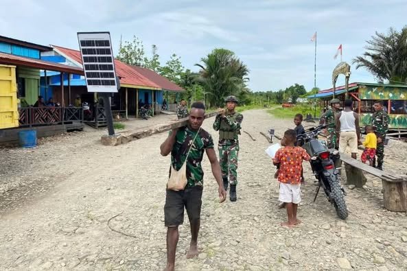 Papua – lintasnusa.com – Satgas Pamtas Mobile RI-PNG Yonif 503/Mayangkara Kostrad memberikan dukungan lampu solar sel untuk masyarakat di Distrik Krepkuri, Kabupaten Nduga Papua.