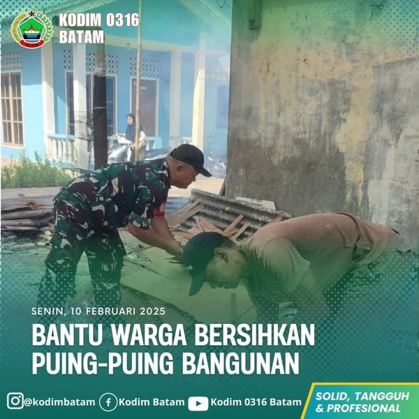 Padang – lintasnusa.com – Babinsa Koramil Belakang Padang Membantu Warga Membersihkan Puing-puing Bangunan di Kampung Tepang Kecamatan Belakang Padang. Senin(10/02/2025).