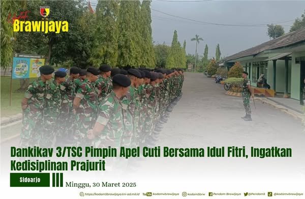 Sidoarjo – lintasnusa.com—Dalam rangka menyambut Hari Raya Idul Fitri 1446 H, Komandan Kompi Kavaleri 3/Tank Scorpion (Dankikav 3/TSC) Kapten Kav Andrie R. Perkasa memimpin apel pemberangkatan cuti bersama di markas satuan. Dalam kesempatan ini, ia menegaskan pentingnya kewaspadaan dan kedisiplinan bagi seluruh prajurit selama menjalani cuti Lebaran.