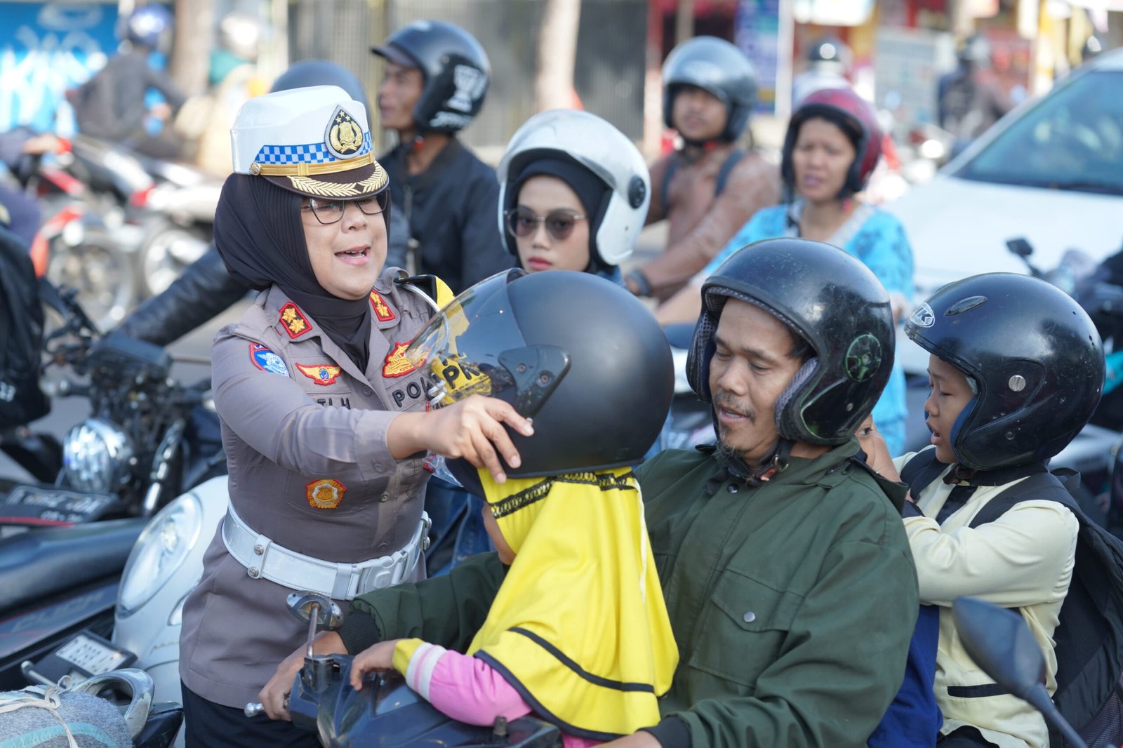Menariknya dalam kegiatan ini, Dit Lantas Polda Jabar membagikan helm SNI kepada para pengendara roda 2 (dua) yang sudah tidak layak digunakan.