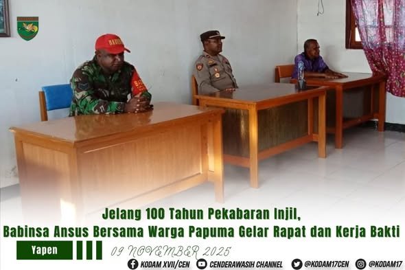 Yapen, Lintasnusa.com ~ Dalam suasana penuh kebersamaan, Babinsa Koramil 1709-04/Ansus, Serka Jekzon R. Horota, menghadiri rapat koordinasi dan kerja bakti bersama warga Kampung Papuma, Distrik Yapen Barat, dalam rangka menyambut perayaan 100 tahun emas Pekabaran Injil di Matoapap Papuma, Minggu (9/11/2025).