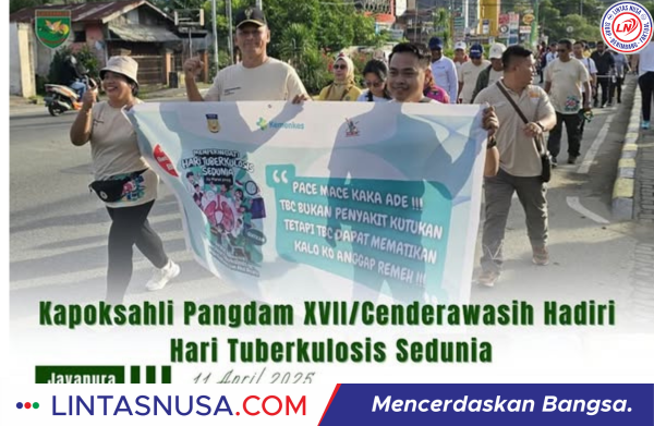 Papua – lintasnusa.com—Pandam XVII/Cenderawasih Mayjen TNI Rudi Puruwito, S.E., M.M, yang diwakili Brigjen TNI Achmad Fauzi, S.I.P, M.M, M.H.I (Kapok Sahli Pangdam XVII/Cen) menghadiri kegiatan puncak Hari Tuberkulosis Sedunia, bertempat di Kantor Dinas Kesehatan Provinsi Papua Kotaraja, Papua, Jumat (11/4/2025).