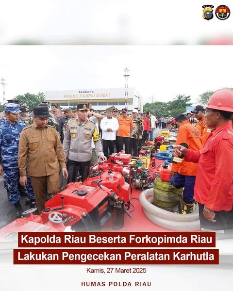 Dumai, 27 Maret 2025 – lintasnusa.com–Kapolda Riau beserta Forum Koordinasi Pimpinan Daerah (Forkopimda) Riau melakukan pengecekan peralatan penanggulangan kebakaran hutan dan lahan (Karhutla) di Bandara Pinang Kampai Dumai. Langkah ini dilakukan untuk memastikan kesiapan personel serta perlengkapan dalam menghadapi potensi kebakaran hutan yang kerap terjadi di wilayah Riau.