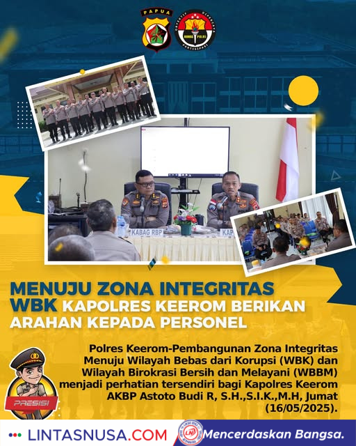 Keerom, Lintasnusa – Dalam rangka memperkuat komitmen terhadap reformasi birokrasi dan pelayanan publik yang bersih dan transparan, Kapolres Keerom AKBP Astoto Budi R., S.H., S.I.K., M.H., memberikan arahan langsung kepada seluruh jajaran personel Polres Keerom dalam kegiatan pembinaan dan pembangunan Zona Integritas menuju Wilayah Bebas dari Korupsi (WBK) dan Wilayah Birokrasi Bersih dan Melayani (WBBM).