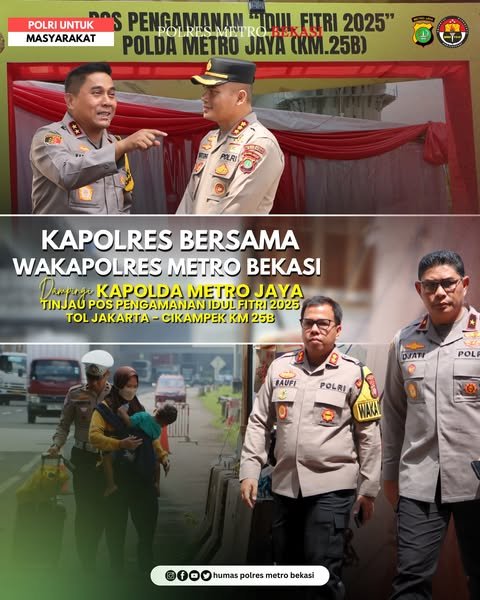 Bekasi – lintasnusa.com–Dalam rangka memastikan kesiapan pengamanan jelang arus mudik dan balik Lebaran 2025, Kapolres Metro Bekasi Kombes Pol. D. Zulfikar dan Wakapolres AKBP D. Raufi mendampingi Kapolda Metro Jaya Irjen Pol. Karyoto saat meninjau Pos Pengamanan “Operasi Ketupat Jaya 2025” yang berlokasi di KM 25B Tol Jakarta – Cikampek, Senin (7/4/2025)..