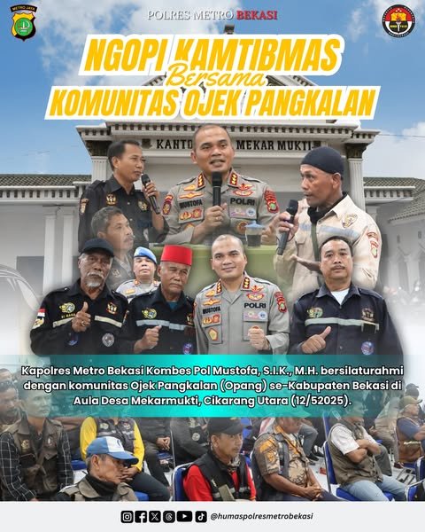 Cikarang Utara – Senin, 12 Mei 2025 – lintasnusa.com– Dalam rangka mempererat hubungan antara Kepolisian dan masyarakat, khususnya para pengemudi ojek pangkalan, Kapolres Metro Bekasi Kombes Pol Mustofa, S.I.K., M.H., melaksanakan kegiatan Ngopi Kamtibmas bersama Komunitas Ojek Pangkalan (Opang) Kabupaten Bekasi. Acara tersebut digelar di Aula Balai Desa Mekarmukti, Kecamatan Cikarang Utara, pada Senin pagi.