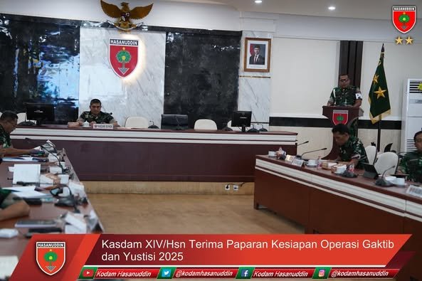 Makassar – lintasnusa.com – Kepala Staf Kodam (Kasdam) XIV/Hasanuddin Brigjen TNI Sugeng Hartono, S.E, M.M., menerima paparan Rencana Operasi Penegakan Ketertiban (Gaktib) dan Yustisi TA. 2025, bertempat di Ruang Bina Yudha (RBY) Makodam, Jl. Urip Sumoharjo, Kota Makassar. Jumat, (7/02/2025).