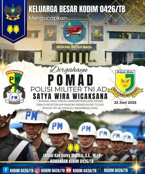 Tulang Bawang, Lintasnusa.com – 22 Juni 2025 Keluarga Besar Komando Distrik Militer (Kodim) 0426/Tulang Bawang menyampaikan ucapan Dirgahayu ke-79 Polisi Militer TNI Angkatan Darat (POMAD) yang jatuh pada tanggal 22 Juni 2025. Ucapan ini disampaikan sebagai bentuk penghormatan dan apresiasi atas dedikasi serta pengabdian para prajurit POMAD dalam menjaga disiplin, penegakan hukum, dan ketertiban di lingkungan TNI Angkatan Darat.