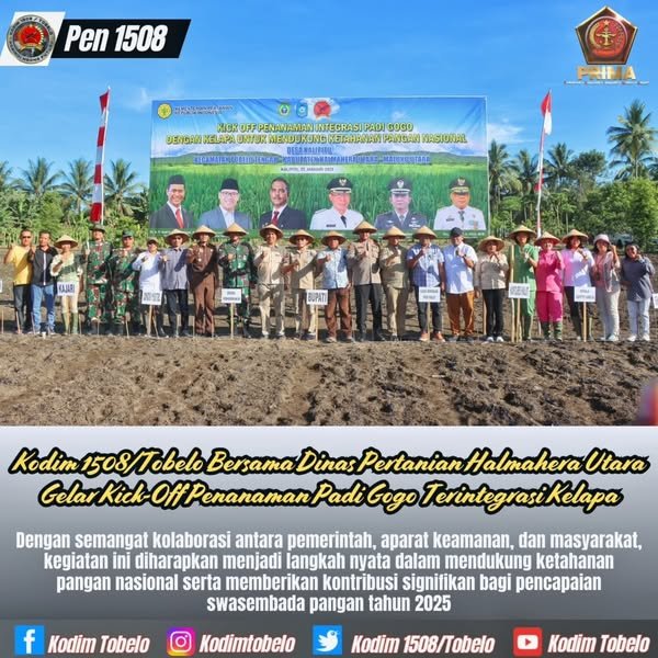 Halmahera Utara–lintasnusa.com–Dalam upaya mendukung swasembada pangan nasional tahun 2025, Kodim 1508/Tobelo bekerja sama dengan Dinas Pertanian Kabupaten Halmahera Utara melaksanakan kegiatan Kick-Off Penanaman Integrasi Padi Gogo dengan Kelapa di Desa Kali Pitu, Kecamatan Tobelo Tengah. Kegiatan ini menjadi langkah strategis untuk memperkuat ketahanan pangan nasional melalui pemanfaatan lahan secara optimal di wilayah Halmahera Utara. Sabtu (25/01/2025)