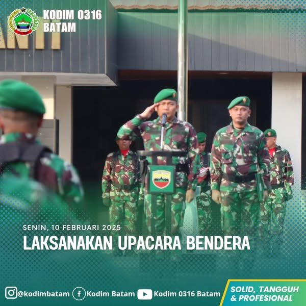 Personil Kodim 0316/Batam melaksanakan upacara bendera mingguan di minggu ke-2 bulan Februari. Kegiatan ini bertujuan untuk selalu mengingat jasa para pahlawan yang telah memperjuangkan kemerdekaan Republik Indonesia.