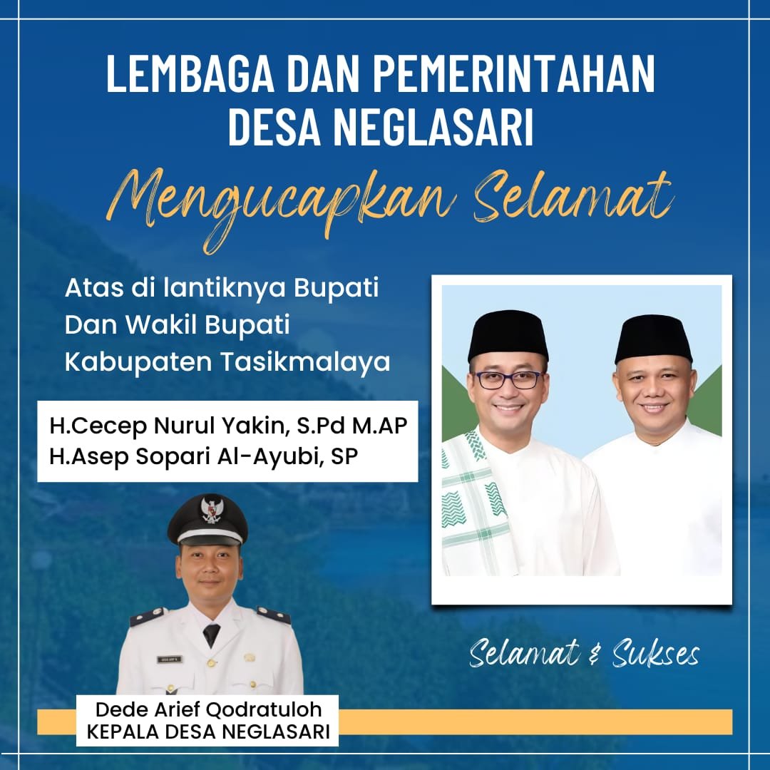 Ucapan tersebut disampaikan langsung oleh Kepala Desa Neglasari, Dede Arief Qodratuloh, sebagai bentuk apresiasi dan dukungan terhadap kepemimpinan baru di Kabupaten Tasikmalaya. Dalam pernyataannya, beliau berharap agar pasangan pemimpin baru ini mampu membawa perubahan positif dan pembangunan yang merata di seluruh wilayah Kabupaten Tasikmalaya, termasuk di Desa Neglasari.