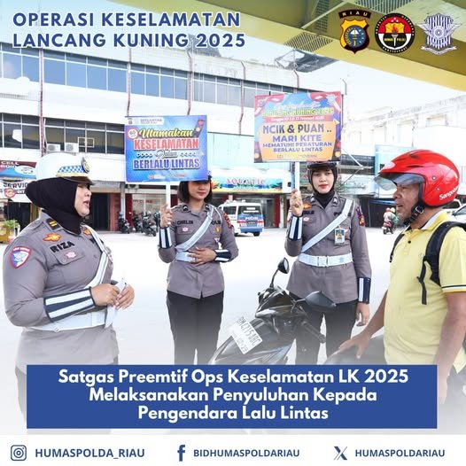 Pekanbaru – lintasnusa.com – Kepolisian Daerah Riau melalui Satuan Tugas Preemtif Operasi Keselamatan Lancang Kuning (LK) 2025 terus menggencarkan edukasi dan penyuluhan kepada para pengendara lalu lintas. Kegiatan ini bertujuan untuk meningkatkan kesadaran masyarakat dalam berlalu lintas serta menekan angka kecelakaan di wilayah hukum Polda Riau.