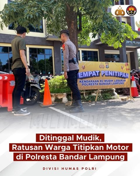 Bandar Lampunglintasnusa.com–Dalam rangka memberikan rasa aman kepada masyarakat selama mudik Lebaran Idul Fitri, Polri melalui Polresta Bandar Lampung, Polda Lampung, menghadirkan layanan penitipan kendaraan roda dua gratis. Program ini bertujuan untuk membantu warga, terutama mereka yang tinggal di indekos atau lingkungan yang kurang aman, agar dapat mudik dengan lebih tenang tanpa mengkhawatirkan keamanan kendaraannya.
