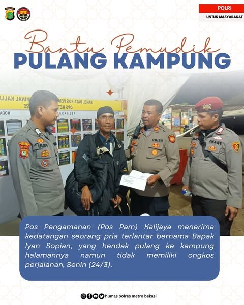 Bapak Iyan, yang sedang dalam perjalanan pulang namun terkendala masalah ongkos perjalanan, ditemukan oleh petugas Pos Pam Kalijaya. Mendapat laporan tersebut, Kepala Operasi Pos Pam (Ka. Os Pam), Iptu Nrimo, bersama anggota lainnya segera merespons dengan cepat. Mereka berkoordinasi untuk memastikan kondisi Bapak Iyan dan memberikan bantuan yang diperlukan.
