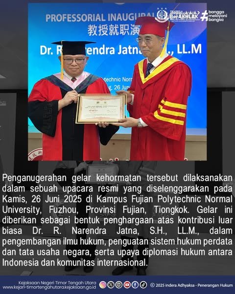 Jakarta, Lintasnusa.com –  27 Juni 2025 Kejaksaan Agung Republik Indonesia, melalui Pusat Penerangan Hukum, dengan bangga mengumumkan bahwa Dr. R. Narendra Jatna, S.H., LL.M., yang saat ini menjabat sebagai Jaksa Agung Muda Bidang Perdata dan Tata Usaha Negara (JAMDATUN), telah resmi menerima Gelar Profesor (Guru Besar) Honoris Causa dari Fujian Polytechnic Normal University, Tiongkok.