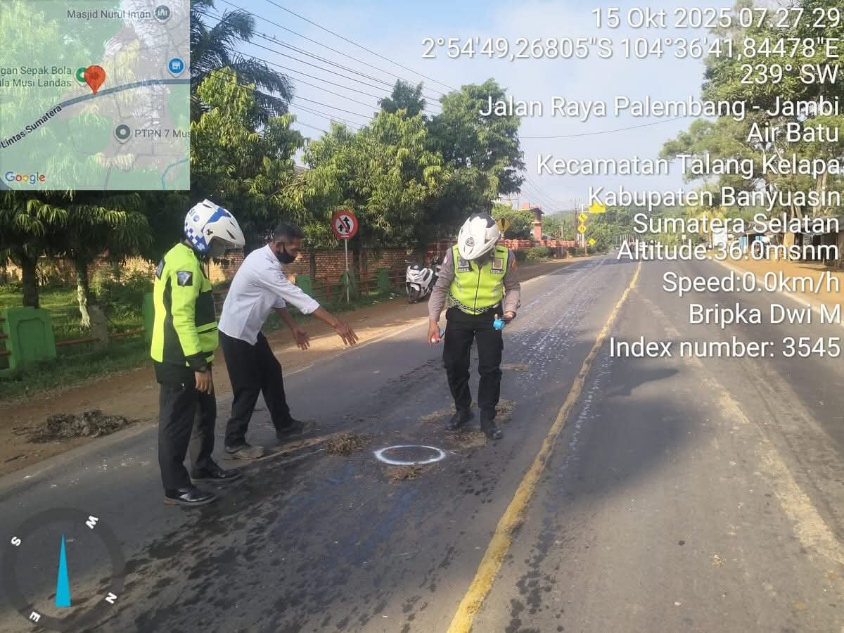 Banyuasin, Lintasnusa.com – 15 Oktober 2025 Personel PATAKA Sat Lantas Polres Banyuasin melaksanakan kegiatan olah Tempat Kejadian Perkara (TKP) atas peristiwa kecelakaan lalu lintas (Lakalantas) yang terjadi di Jalan Lintas Palembang – Jambi KM. 21, tepatnya di seputaran Musi Landas, Kecamatan Sembawa, pada Rabu (15/10/2025).