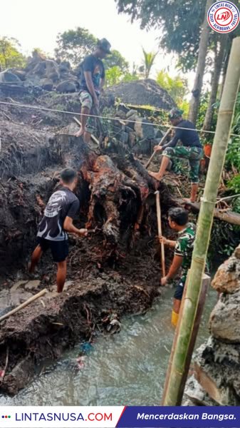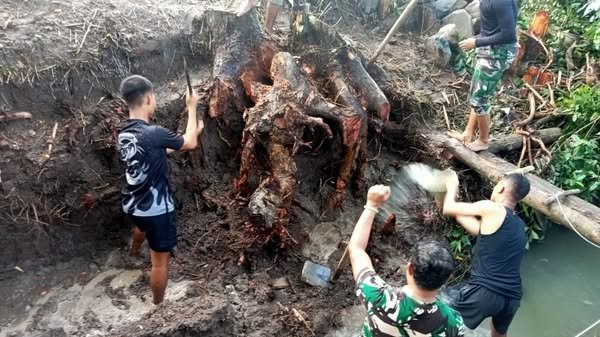 Salah satu kegiatan yang dilakukan adalah pembongkaran akar pohon besar yang menghambat proses pembangunan pondasi jembatan di Desa Bagu, Kecamatan Pringgarata, Kabupaten Lombok Tengah, pada Jumat (16/5/2025).