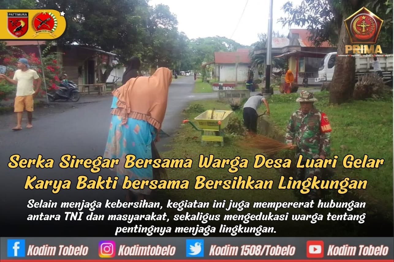 Halmahera Utara –, Dikenal karena keindahan pantainya serta sering dikunjungi wisatawan dari berbagai daerah Serka Siregar, Babinsa Koramil 1508-01/Tobelo, bersama masyarakat setempat melaksanakan karya bakti membersihkan lingkungan desa Untuk menjaga keasrian dan kenyamanan lingkungan, Desa Luari, Kecamatan Tobelo Utara, Kabupaten Halmahera Utara.