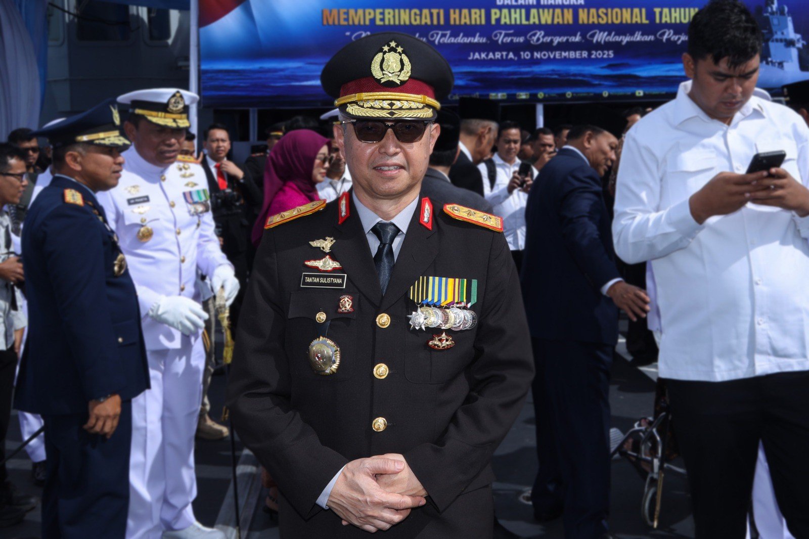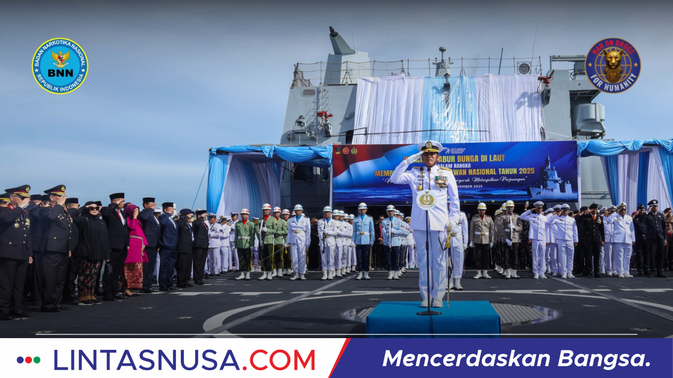 Jakarta, Lintasnusa.com – 10 November 2025 Sekretaris Utama Badan Narkotika Nasional Republik Indonesia (BNN RI), Tantan Sulistyana, menghadiri Upacara Tabur Bunga dalam rangka memperingati Hari Pahlawan, Senin (10/11). Kegiatan berlangsung khidmat di atas KRI Brawijaya 320 yang berlayar di perairan Teluk Jakarta, Jakarta Utara.