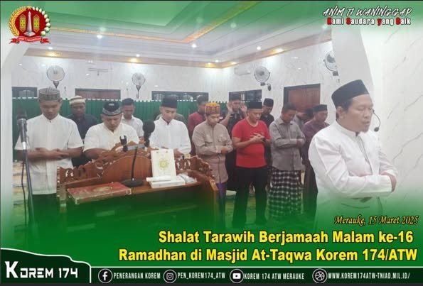 Merauke – lintasnusa.com – Dalam rangka meningkatkan ibadah di bulan suci Ramadhan, jajaran Korem 174/Anim Ti Waninggap (ATW) melaksanakan Shalat Tarawih berjamaah di Masjid At-Taqwa Korem 174/ATW pada malam ke-16 Ramadhan, Sabtu (15/3/2025). Kegiatan ini diikuti oleh para prajurit, anggota keluarga, serta masyarakat sekitar.
