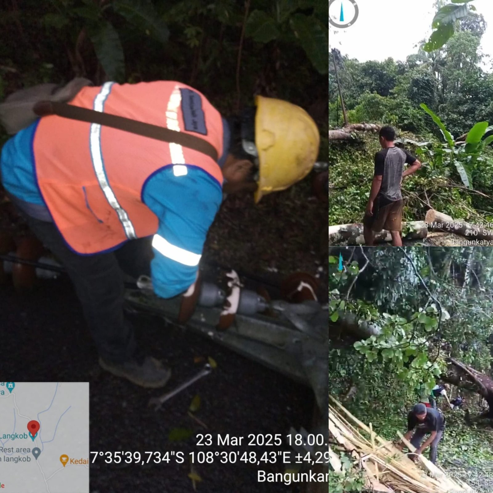 Dalam proses normalisasi jaringan, warga Bangunkarya turut serta membantu melakukan pengamanan pohon di sekitar titik gangguan yang menghalangi akses jalan.