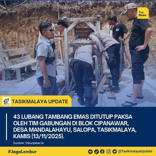 Tasikmalaya, Lintasnusa.com – Pemerintah Kabupaten Tasikmalaya melalui tim gabungan yang terdiri dari aparat kepolisian, TNI, Satpol PP, dan unsur pemerintah daerah melakukan penutupan paksa 43 lubang tambang emas ilegal di Blok Cipanawar, Desa Mandalahayu, Kecamatan Salopa, pada Kamis (13/11/2025).