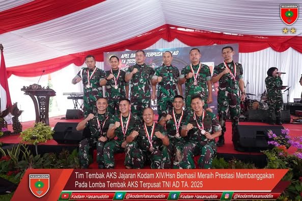 Karawang – lintasnusa.com-Tim Tembak Apel Komandan Satuan (AKS) Kodam XIV/Hasanuddin yang terdiri dari Komandan Rindam (Danrindam), Asisten Operasi (Asops) Kasdam serta Komandan Satuan Tempur (Dansatpur) maupun Komandan Satuan Bantuan Tempur (Dansatbanpur) jajaran Kodam XIV/Hasanuddin, berhasil meraih prestasi membanggakan dengan meraih juara ketiga pada lomba tembak antar Kotama pada AKS Terpusat TNI AD TA. 2025, yang berlangsung di Resimen Latihan dan Pertempuran (Menlatpur) Kostrad, Sanggabuana, Karawang, Jawa Barat. Selasa, (18/02/2025).