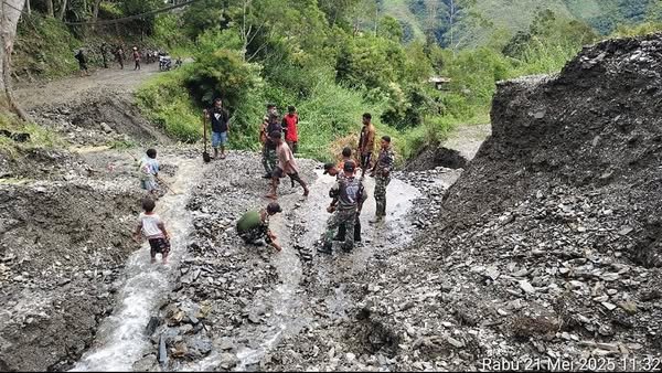 Perbaikan jalan dilakukan secara manual dengan alat seadanya, namun semangat kebersamaan antara prajurit TNI dan masyarakat menjadi kekuatan utama dalam menyelesaikan pekerjaan tersebut.