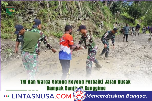 TNI dan Warga Gotong Royong Perbaiki Jalan Rusak Dampak Banjir di Kanggime