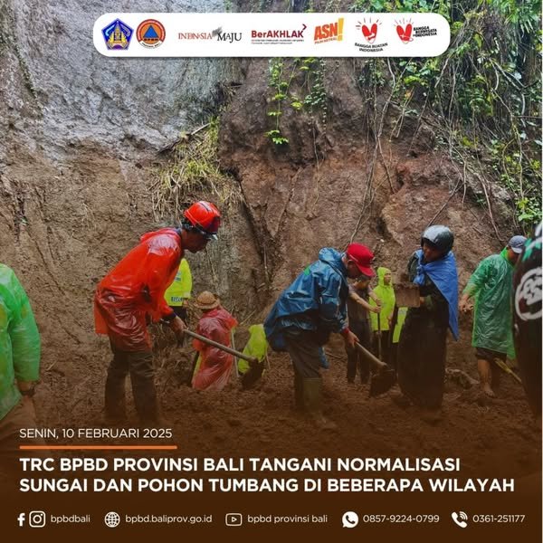 BPBD Bali – LINTASNUSA.COM – Rabu, 12 Februari 2025 – Hujan lebat disertai angin kencang yang melanda beberapa wilayah di Bali pada Senin (10/2) menyebabkan beberapa kejadian di wilayah Bali. Tim Reaksi Cepat (TRC) BPBD Provinsi Bali bersama BPBD Kabupaten Klungkung melaksanakan kegiatan normalisasi sungai di Subak Pau, Dusun Pau, Desa Tihingan, Kecamatan Banjarangkan. Normalisasi ini dilakukan untuk mengantisipasi banjir akibat sedimentasi di aliran sungai. Kegiatan yang berlangsung sejak pagi hingga sore ini melibatkan berbagai pihak, termasuk TNI, Polres Klungkung, Tagana, PMI, dan masyarakat setempat. Dengan menggunakan cangkul, sekop, parang, dan mesin pompa alko, tim berhasil membersihkan sungai dan memastikan aliran air kembali normal.